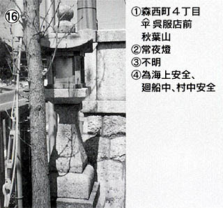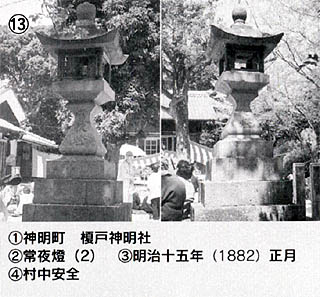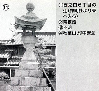 建てる場所も、秋葉社のすぐ前から、秋葉社へ通じる道端、あるいは、はるか遠州の秋葉山に向かって建てられる場合もあった。西之口は、町のまん中の四つ辻に建っているし、多屋では、海椙神社参道入口の旧街道添いに、瀬木は、相持院裏の道端、樽水は、3丁目の辻に、熊野では、熊野神社参道の辻に、古場は、4丁目の道端に、小鈴谷は、町中の辻に建てられていて、今も、電燈を引いて夜の街燈の役を果たしているものもある。暗い夜道を歩いて村へ帰ってきて、村の入口や村の中の常夜燈に迎えられて、ほっとした人も多か
