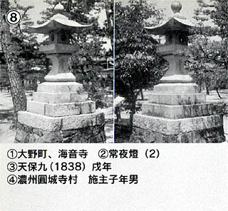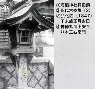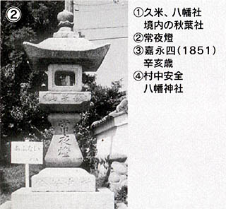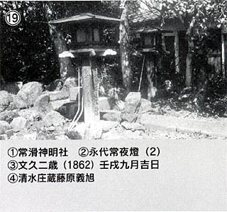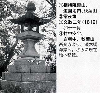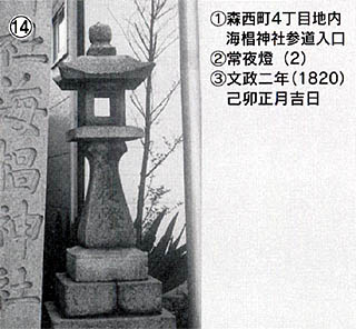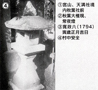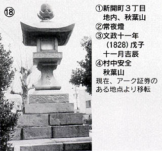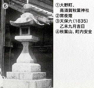 常滑市内での最古の常夜燈は、宮山の天満社に合祀されている秋葉社前のもので、受け台の正面に「秋葉大権現常夜燈」、右側に「寛政六寅歳正月吉日」、左側に「村中安全」と刻まれている。その後、市内では、享和年間に一基、文化年間に五基、文政年間九基、天保年問八基、弘化・嘉永・文久・元治に各一基ずつ、明治四基、大正一基と建てられていった。化政時代が建立のピークであったようだ。これは、当地方で秋葉信仰が盛り上がった時代であったばかりでなく、このころに、菜種油などの植物油が大量生産され、問屋や