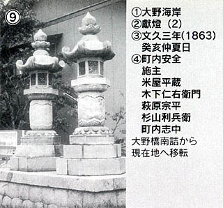 中安全」、あるいは建立年月等が刻まれているのが普通である。その下は、下にいくほど大きい台が階段状に四段積まれている。背の高いものは、一番下の基礎の石垣が高く組まれているのである。概して、常夜燈の形は、献燈のための燈籠に比べて、装飾や模様も少なく、単純で素朴、下が広がってどっしりとした安定感がある。