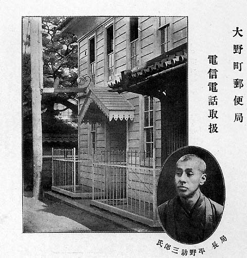 大野郵便局は、明治7年(1874)6月10日、大野町字十王町において、業務を開始しました。 明治22年(1889〕5月、字市場町のこの局舎へ移転しました。 ちなみに、大野郵便局における電信事務の開始は、明治26年(1893)3月16日、電話事務の開始は、明治41年(1908)3月31日でありました。