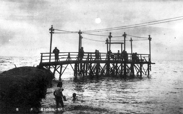 当時の海水浴場には石蔵から海に張出した桟橋や海中飛込台もありました。桟橋には電灯もつき夕涼みに訪 れる人々で賑わいました。鈴鹿の山々に落ちる夕日、海は金波、銀波に輝き、黒い桟橋のシルエットと相俟ってそれは美しい景観でした。