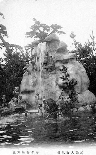 「新舞子の発展は、又大野の浴場設備の上に、大なる刺激を与えた。新舞子で活動写真を開放的に公開すれば、大野では動力で汐滝を落として見せるとか様々の浴客吸引策が講ぜられている。」