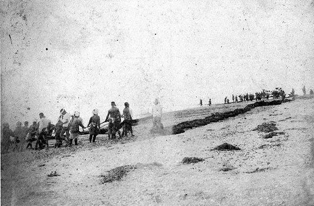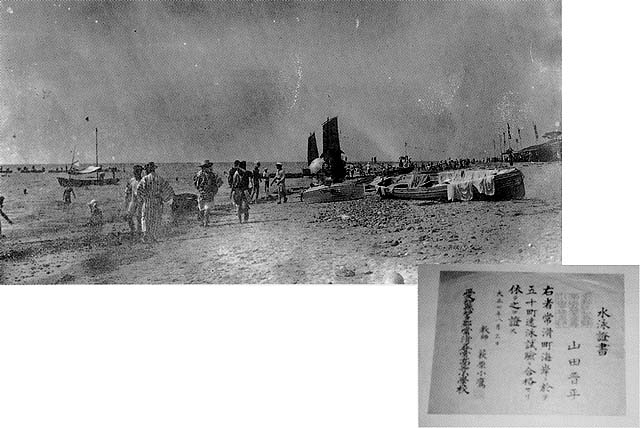 四日市の沖まで泳いで行った青少年たちに、何艘も舟がつき、ドオーン、ドオーンと太鼓を叩き励まして行ったようです。 名前を忘れましたが○○流の水泳学校の行事でした。