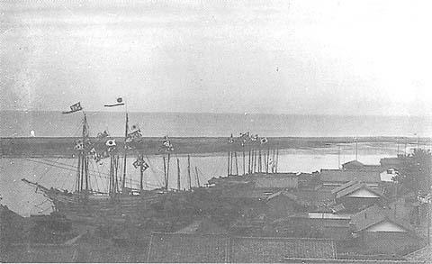 大漁旗を掲げて旧正月のお祝いでしょうか、向こうに見えるのは大浜の砂防です。