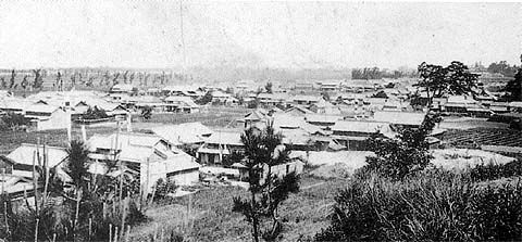 北条栄交差点の山長さん西より、大浜、海泉を望む。 はるかに見える上の砂防が大浜で、その右辺りは現在市民病院であり、 その右上辺りが海泉の松林です。