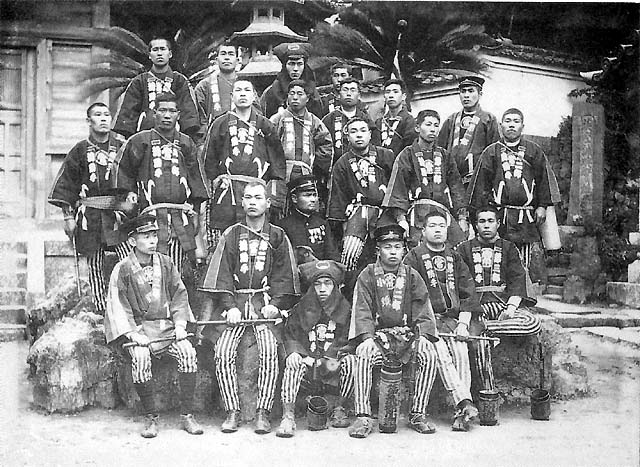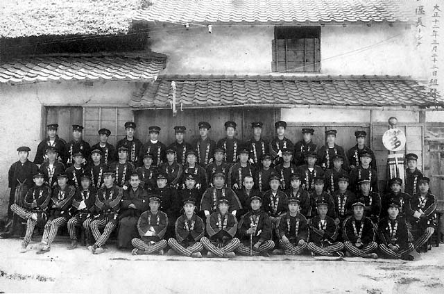 弓張提灯に所属部隊名が正面に書いてあり、平常は左の腰帯に持手を差す。火事場頭巾は紐で右肩か ら斜に下げる。鳶口は消火の時引っ掛けて使います。草鞋に紺足袋縞の股引の下の方に脛巾(ハバキ) を着けた人もいます。刺子半纏肩から袖口まで赤い1Ocm位の横縞がありました。(今でも消防団の服 はこれかな) 軍服の人は山田陶山氏で日露戦争で戦功をたてた人で常滑消防組の組頭です。