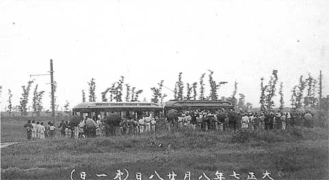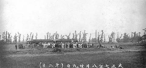 大草(知多市)のお地蔵さんへお詣りの人たちでしょうか、昔はお詣りが、よう賑わったもんでした。それとも、多屋に何かあったでしょうか。この頃はまだ電車がめずらしくて、子供たちは新田の道を電車について、走ったものでした。