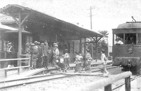 常滑線も便利になりました。電車に乗り、お里帰りの人たち。男の人はカンカン帽をかぶり、女の人は丸髷や二百三高地の髪形に結って見えます。