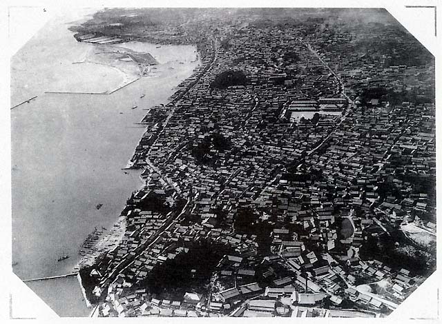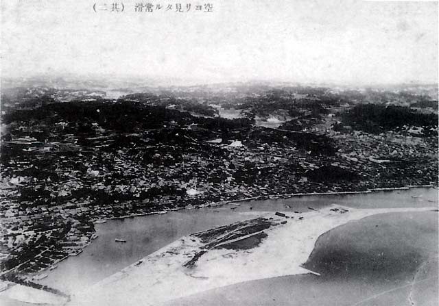 当時、新舞子海岸にあった安藤飛行機研究所が撮影。町の南にある天沢院上空より北方を見た写真。 当時の町並みと海岸線の形状を知る大切な写真です。エンジンの音が聞こえてきそうな風景です。 撮影担当は藤井廣吉氏。