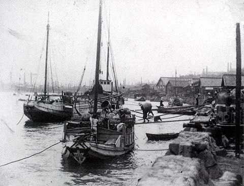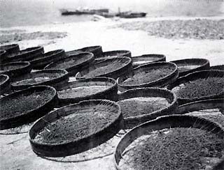歩くたびに揺れる細いアユミを、ひょいひょいと大きなかめを背に運ぶ仲仕さんです。 男の人ばかりでなく、女仲仕さんも見えます。