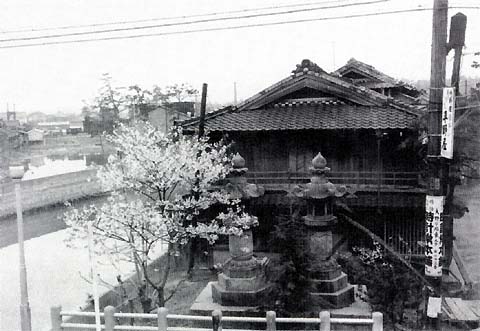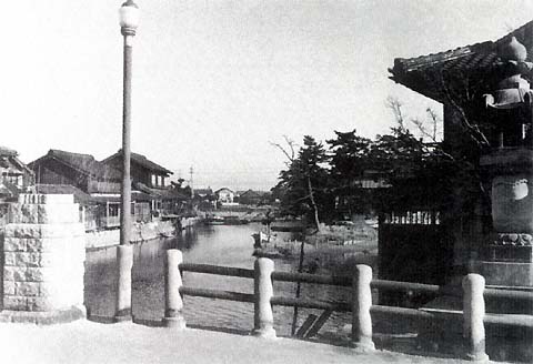 矢田川にかかっている大野橋周辺の風景です。右端に常夜燈が健在です。 写真中央の松の木立辺りは中の島です。中の島劇場がありました。