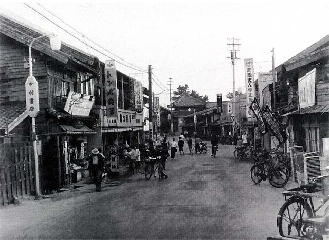 大野橋から、南方の十王堂を見た風景です。 大野も、こんなに賑やかでした。当時の交通手段の主力はこ覧の通り、自転車でした。