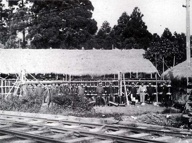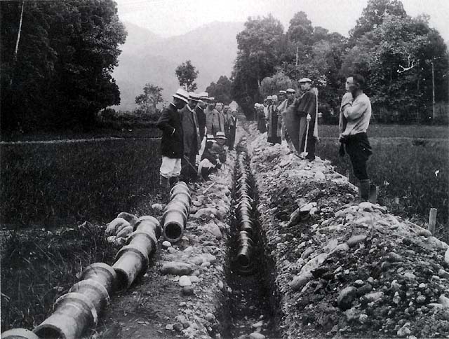 大正12年金沢市出町の上水道に陶管使用の為の接合作業所と書いた立札があるから、受注した陶栄社の作業員と水道局及び市の職員との記念写真のようです。仮設の藁屋根の中に3本運結した土管がありますから、地上で組んでから埋めたのでしょうか?