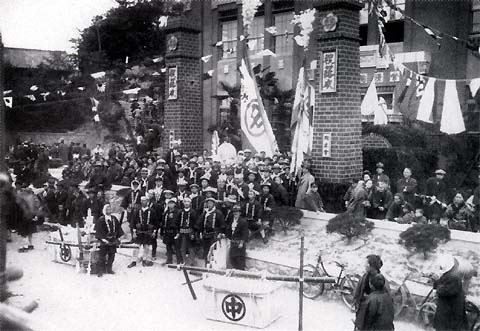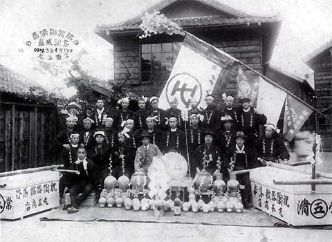 落成式の祝い花火を打ち上げるため、花火玉を入れた長持を陶栄株式会社工場の工員達がお神酒をいただいた後、打ち上げ場所大浜まで花火歌を歌いながら行列していきました。