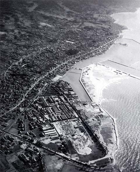 台風13号により町と海岸が大打撃を受けた直後の写真。 港内には大浜へ渡る木橋と建設中の旋回ブリッジ(北条大橋、昭和30年完成)が見えます。