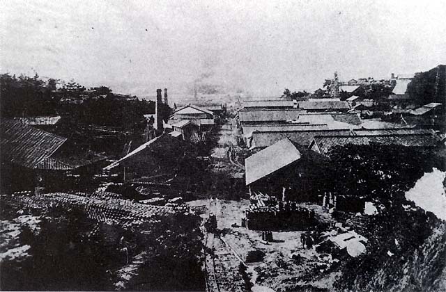 いちき橋あたり、レールの中程にトロッコを押している人が見えます。 このトロッコで運んだ土は、現在の日本陶業辺りや道西の丸岩工業本宅辺りまで田圃だったので、その土で埋めたといいます。