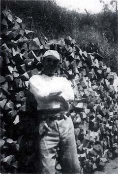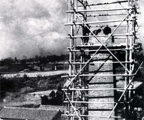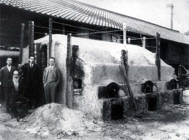 今までの瓦窯は焚き口が1ケ所でしたが、焚き口を多くして火の回りをよくし、下の口には水をはって燃料の薪や石炭を焚き、瓦をいぶしてつやだしをした試験窯です。 焚き試験が終わった後で記念写真。 右から:水野秋治氏、伊奈辰次郎氏、山本三一氏、杉江武寿氏。