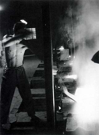 石炭窯は時間の勝負。火色を確かめて、石炭を入れる。