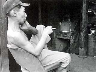 昔の仕事着はシャツに股引が主流でしたが、写真の人はズポンです。しかしバンドではなく紐です。何故なら腹が減るとズポンが下がり、腹に力が入らなくなるので、わざと紐にして空腹の度合によって、調節できたからです。