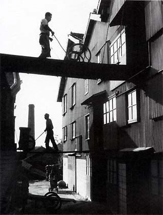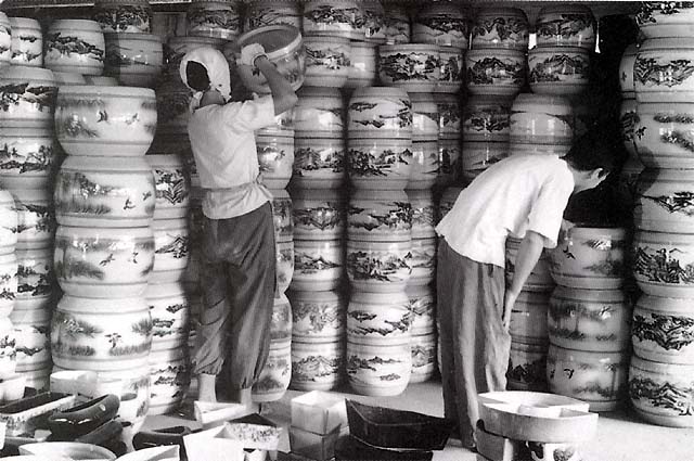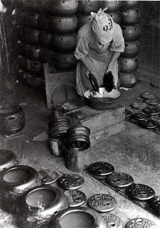 鯨から採ったニカワ(ドーサと言った)を煮解かして、うるし塗りの下地に掛けた、煮込みうどんを家中で囲 んだ鍋の大変身。 この写真の作業の後、出荷までに12,3回の手間が掛かっています。手に持っているのは炬燵火鉢の蓋、積 んであるのは炬燵火鉢の胴です。手拭をかむるのは若い娘です。