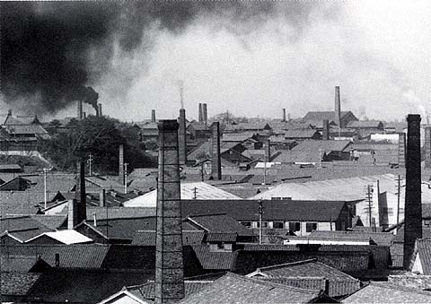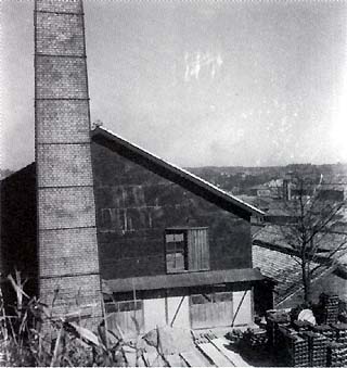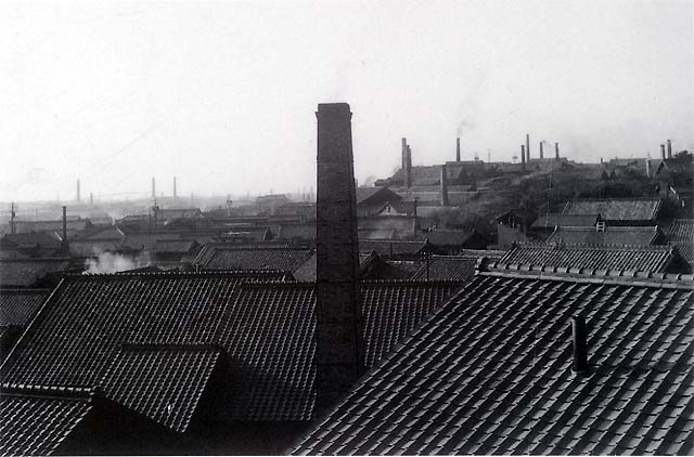 右側の大屋根の小さい煙突の様なものは窯の目玉の熱を逃すためのものです。右方の民家の屋根上の台形の白いものは初期のテレビのアンテナの台のようです。遥かに煙突がたくさん見えます。