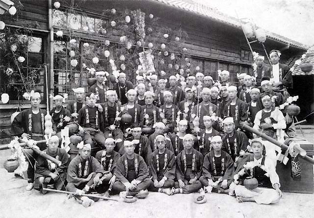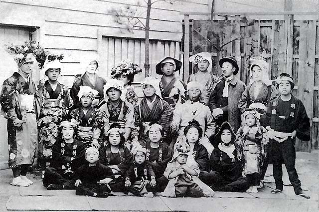 大野海音寺境内において、権現町町内有志のあでやかな、勇しい、かわいい、老若男女の連中。 「ボクはおとうさん座りだぞ」 はっぴは、借り物でまちまちです。