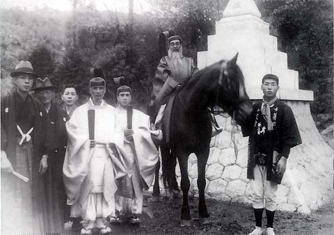 馬上は山本三一氏(60才)(山本組) 当時氏子総代で祭礼の音頭取りをしました。戦後2年後にこのようなお祭りが奥条字の人々の力で執り行われました。お鍬祭りは新池を造る時に使った鍬をまとめて埋めた所に松を植えたのでお鍬松と言うようになり、61年目に祭事が行われて字総代の屋敷にお供えものを飾り、字一番の長老をコシに乗せてお鍬社へ行列して行きました。