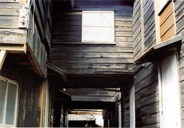 2階の仕事場と向いの仕事場の2階に渡された廊下で、2階の製品を向いの2階へ運ぶのにいちいち下へ降ろして運ぶのは大変なので、渡り廊下を造って手問と時間を短縮しました。(今では許可されませんが、昔は役所に届ければ許可が下りて造る事ができました)