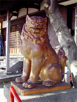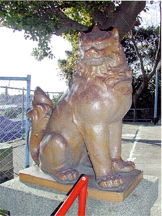 片岡静観氏 昭和17年制作、焼締、85cm 静観の父、長が阿弥陀堂建て直しの世話人を務めていたため、狛犬のみならず、阿弥陀堂の天井絵、欄問の木彫なども静観の作となっています。