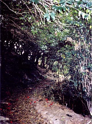 大善院の上中の宮の後ろを通る小道。踏み外せば岩廻間の谷へ落ちそうな所ですが、急な崖の上です。