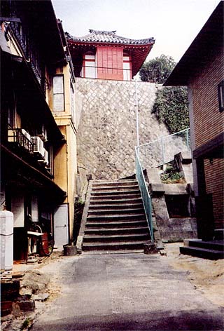 稲荷の祠の裏側より写す。左側は水野屋旅館です。西の土手は石垣があったそうですが、今はコンクリートになってしまいました。常滑城郭の西端と聞いています。