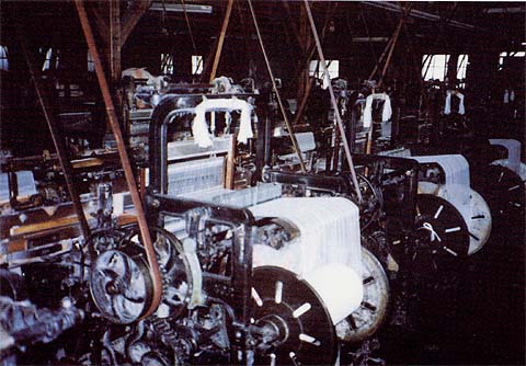全自動のため、機械が動く中に2,3人の女子工員が、糸の切れや織機の具合を見廻っていました。