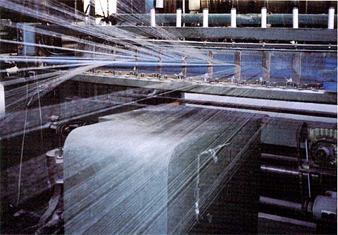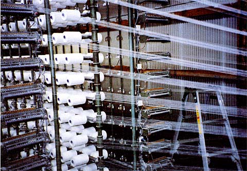 布巾により糸の本数は決っていません。木管から繰り出されてゆく綿糸の白く輝くのは、工場内の騒音を忘れさすほどの美しさ。手織りの時代は「ハタをヘル」と言って、人の手で行ったり来たりして「チキリ」に捲いて「ハタゴ」に仕組みました。糸のチーズ巻きのようです。