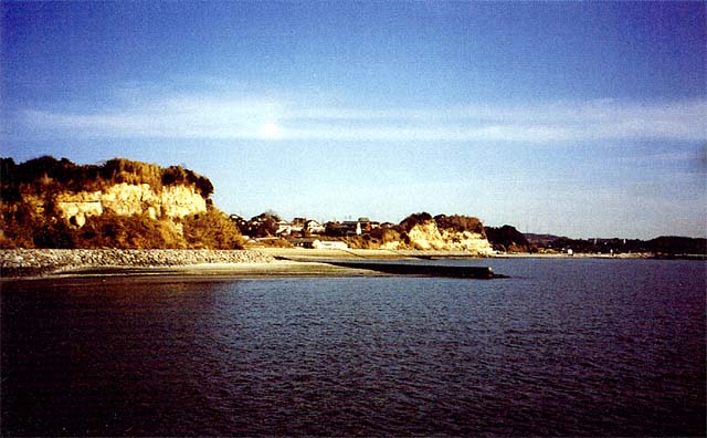 海から見る時は、丘陵の縁と海の青色の間に扇形をした赤白い地肌を連ねて奇観を呈します。これらの崖の